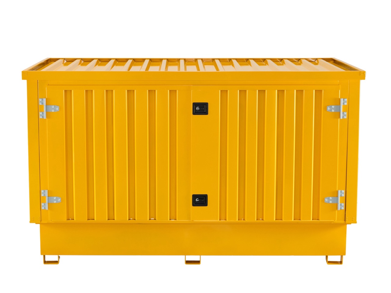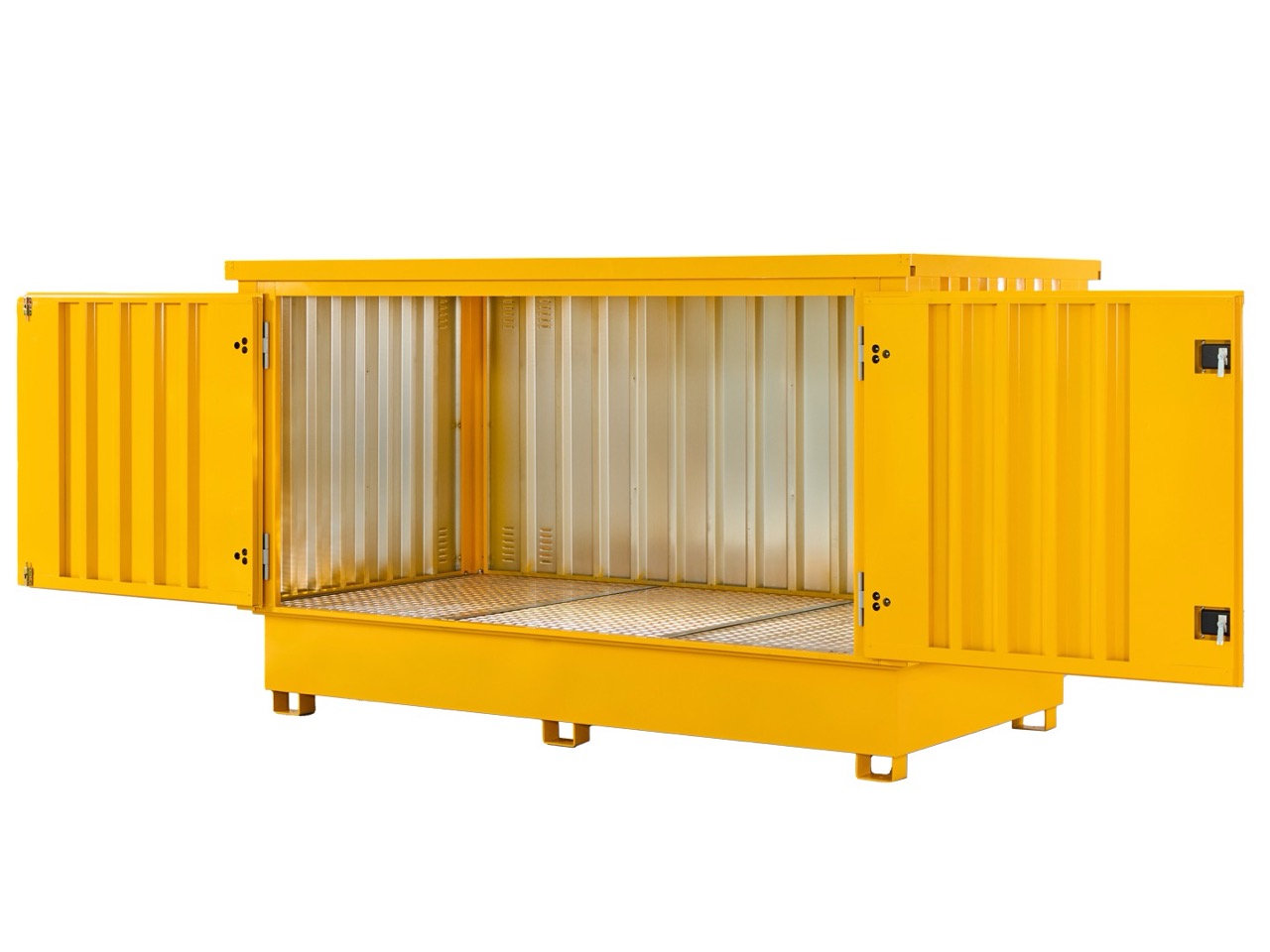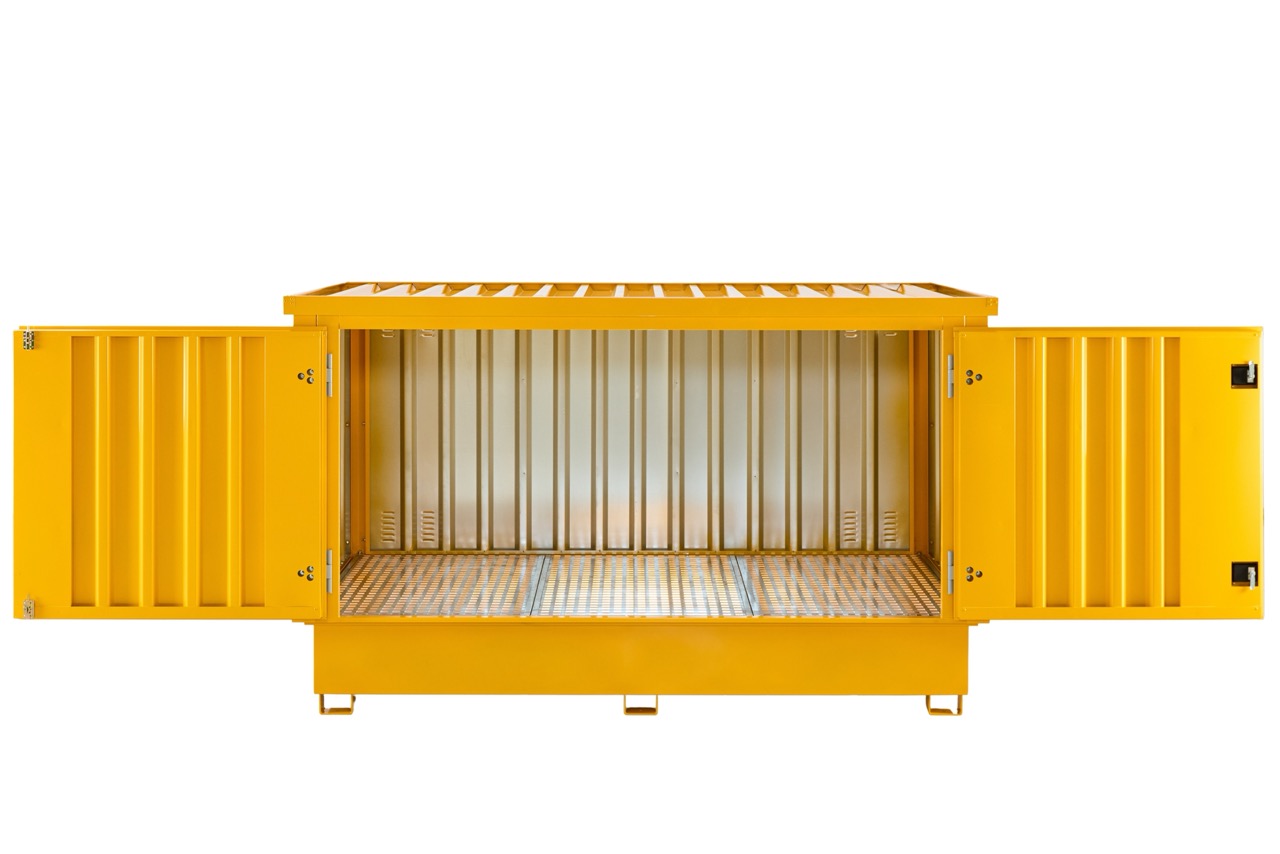 The leakproof sump with grating ensures safety in case of spills, while vents in the panels promote air circulation. This container combines functionality and convenience, offering an efficient storage solution for businesses that need to handle multiple IBC tanks.
